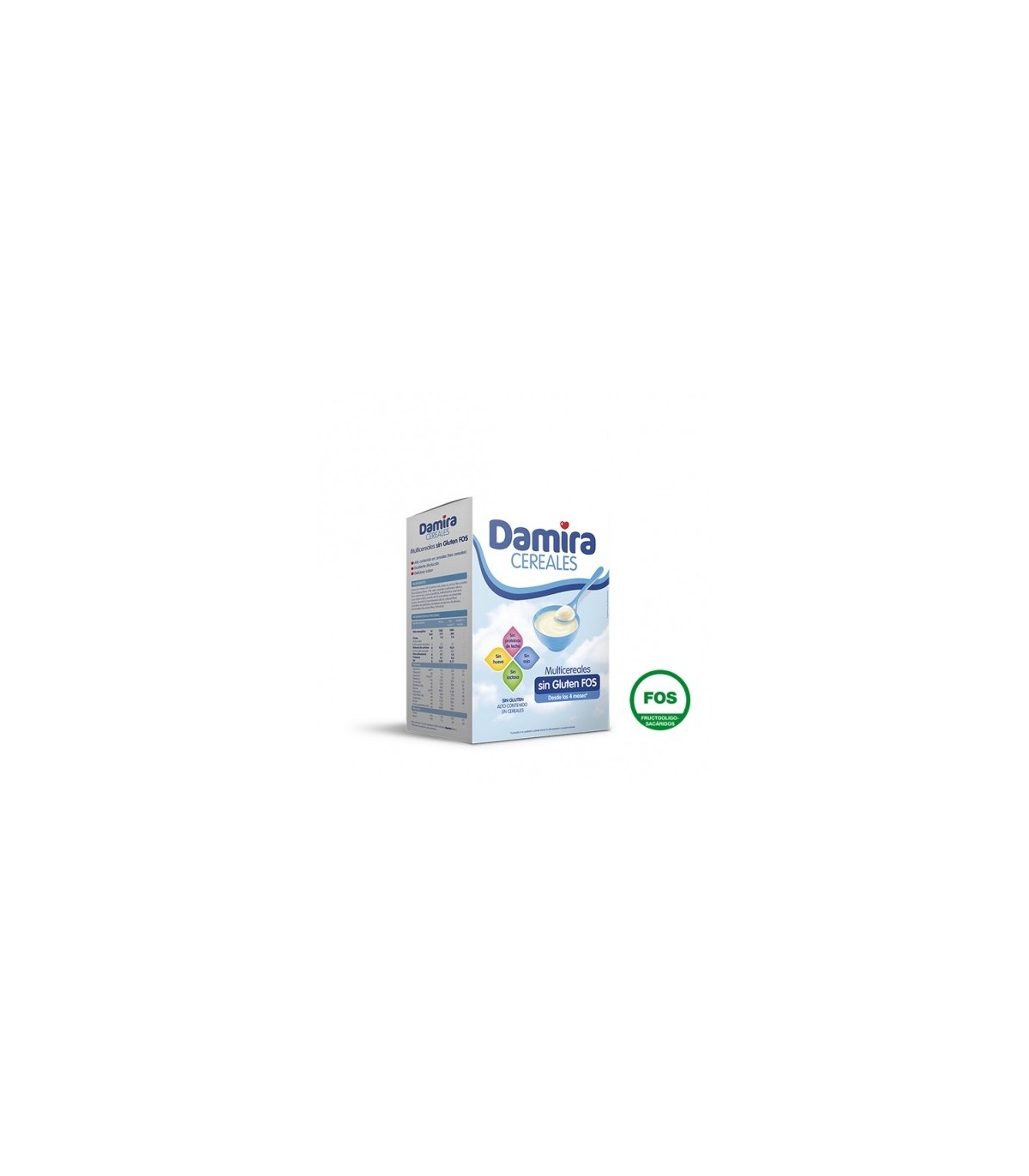 Damira Multicereales Sin Gluten FOS 600 g. Es una papilla con cereales hidrolizados encimáticamente para facilitar la digestión del bebé. Contiene Fuctooligosacáridos (FOS), sin alergenos: Proteínas de leche, lactosa, huevo, soja, ni gluten.