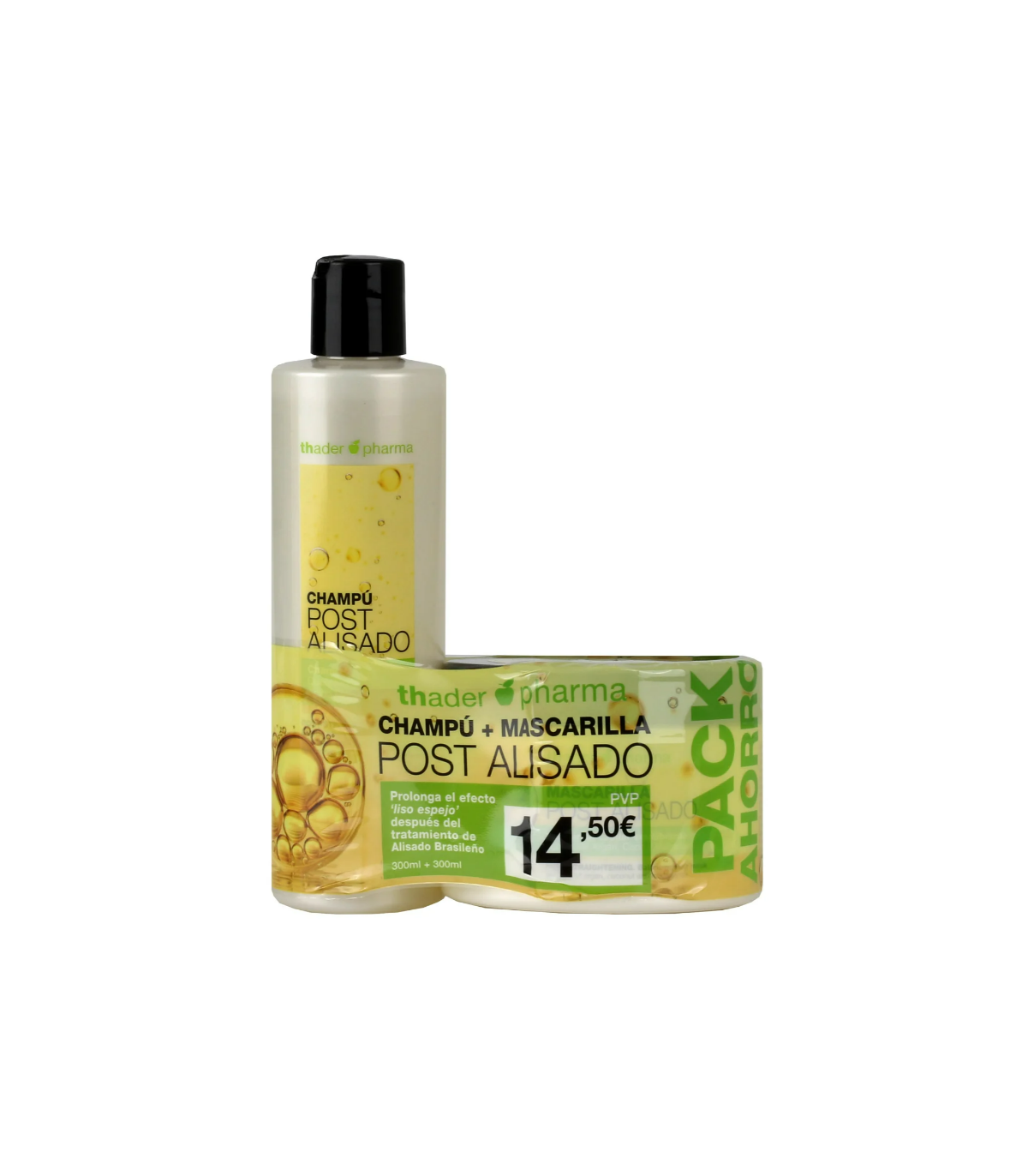 Duplo de productos que contribuyen a mantener el cabello alisado y a reducir el encrespamiento. Contiene un champú de 300ml, formulado con proteínas vegetales que ayudan a eliminar las impurezas del cuero cabelludo sin resecar. Además, cuenta con una mascarilla de 300ml, con queratina y ácido hialurónico, que favorecen el refuerzo de la protección capilar frente a las agresiones externas. Incluye aceite de macadamia, almendras dulces, ésteres de argán y coco.