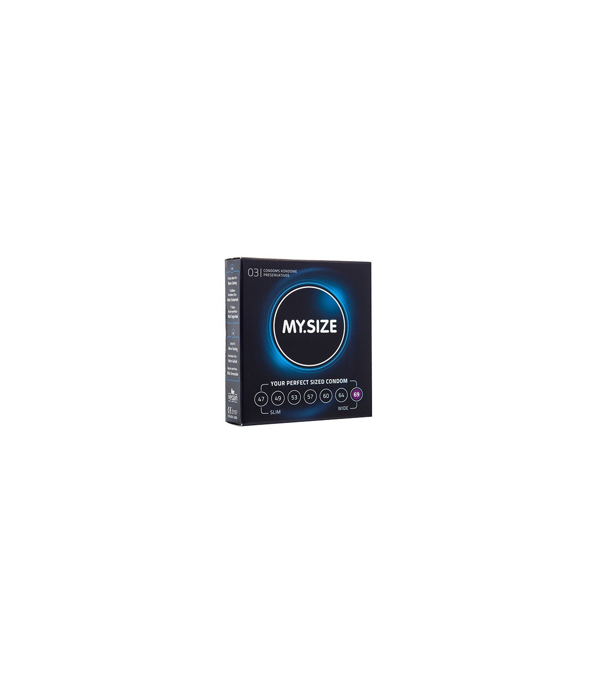 My Size ofrece preservativos de 7 tallas diferentes para que puedas disfrutar de tus relaciones sin preocuparte por el tamaño: 47-49-53-57-60-64-69.