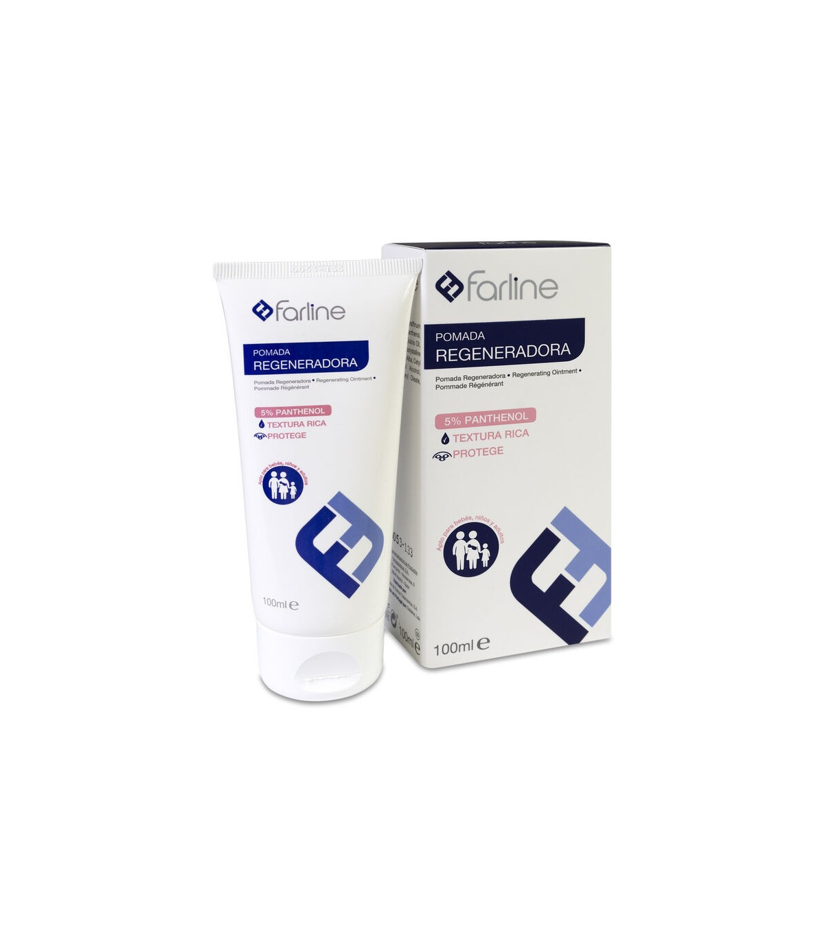 Farline Pomada Regeneradora 5% Panthenol y alto contenido lipídico que ayuda a reparar la piel muy seca y agrietada.