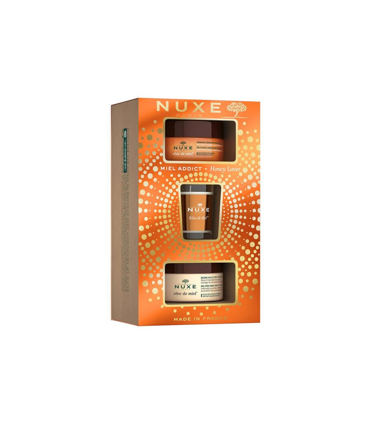 Nuxe Reve de Miel Cofre Miel Addict: Nuxe Reve de Miel Exfoliante Corporal Nutritivo + Nuxe Reve de Miel Bálsamo Aceite Corporal Fundente con Miel + Vela Reve de Miel