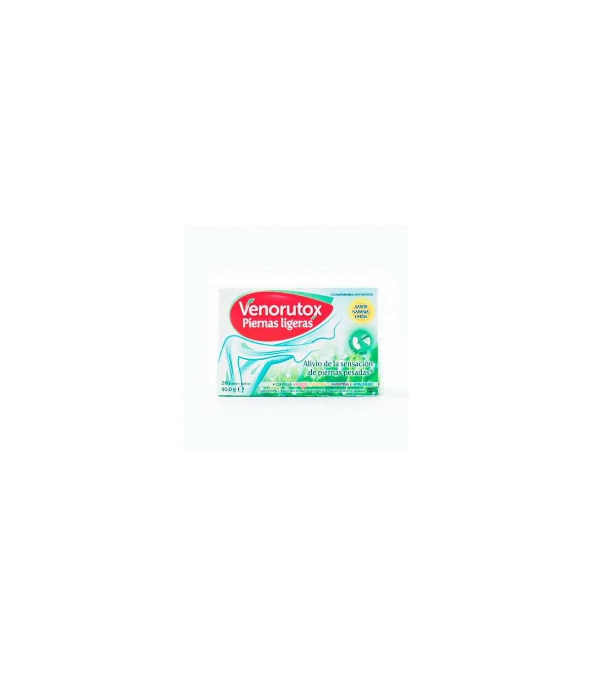 Complemento alimenticio para aliviar las piernas cansadas y mejorar su circulación.Venorutox Piernas Ligeras Sabor Naranja-Limón 20 Sobres es un complemento alimenticio para aliviar el cansancio de las piernas y activar su circulación. Está indicado para personas que permanecen mucho tiempo de pie. Funciona a través de los activos de centella asiática que favorecen la circulación venosa de las piernas, el rusco que las alivia y revitaliza, la vitamina C para beneficiar la formación del colágeno, la vitamina E actúa contra el daño oxidativo y el magnesio que contribuye a reducir el cansancio.