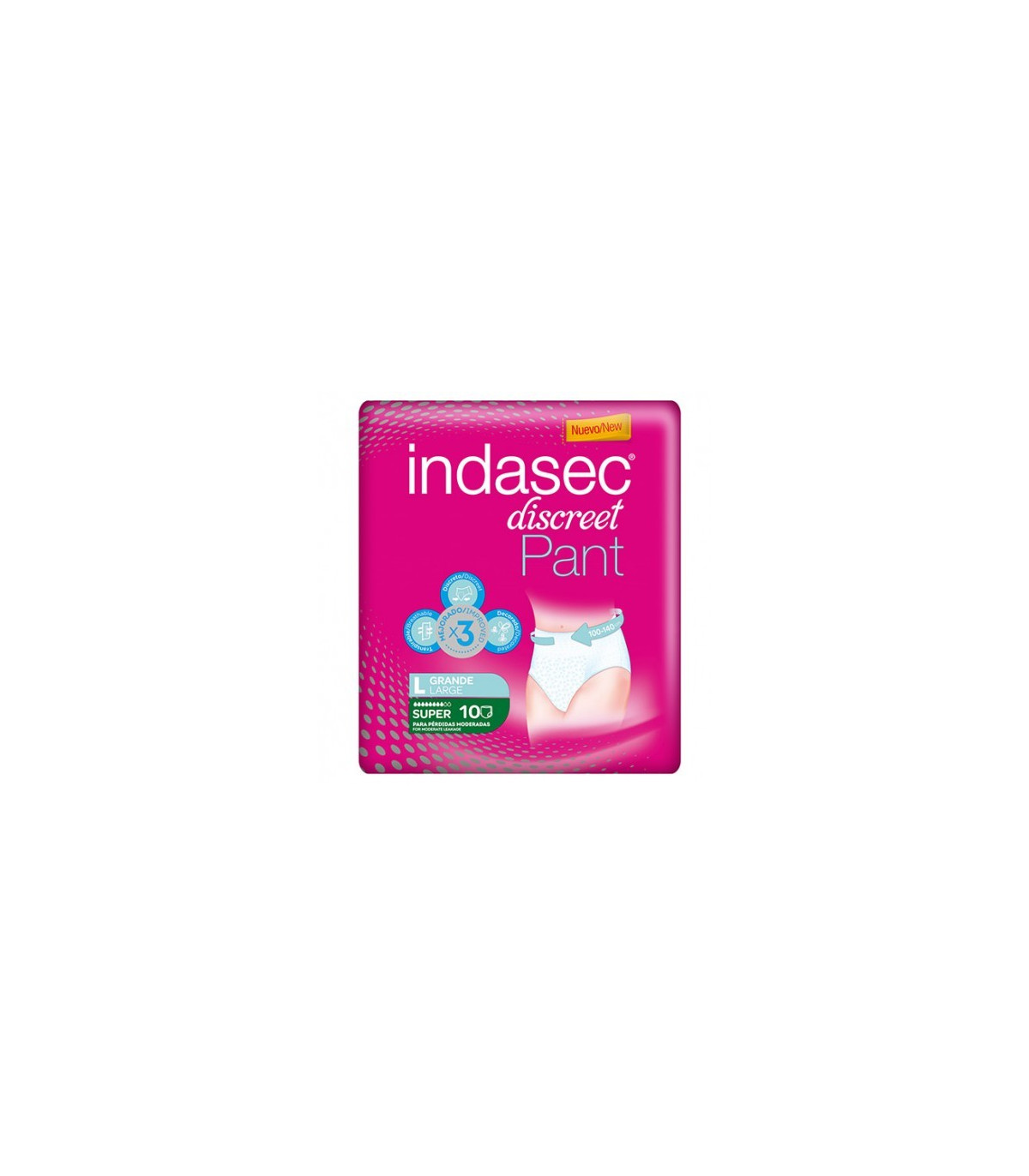 Pantalón desechable absorbentes para pérdidas de orina moderadas. Apto para hombres y mujeres. Es discreto y cómodo. Talla grande.Indasec Pant Super Talla Grande 10 Unidades es un pantalón desechable para hombres y mujeres que sufren pérdidas de orina moderadas. Su tecnología invisible adaptativa hace que quede ceñido en la zona de la entrepierna y evitar así incómodos abultamientos. Este está diseñado para permitir que estas personas disfruten de los momentos más especiales, sin sentirse incómodos o preocupados por el olor o las pérdidas de orina. Tiene barreras transversales para evitar escapes, indicadores del nivel de saturación e hilos elásticos que permiten su perfecto ajuste.