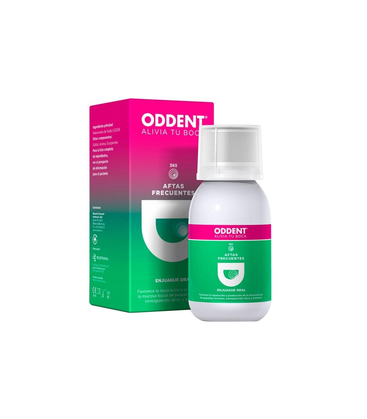 Oddent Aftas Frecuentes Enjuague Oral 300 ml. Colutorio formulado con ácido hialurónico que favorece la reparación de aftas, heridas bucales y tejidos dañados.