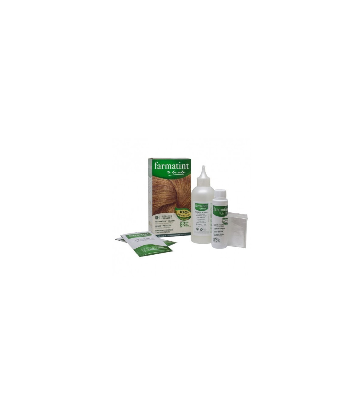 Farmatint 8R Rubio Claro Cobrizo 150ml es una coloración permanente de color rubio cobrizo. Este kit contiene un bote de tinte, un aplicador, Active Color Complex y guantes protectores. Su formulación es sin amoniaco y con ingredientes vegetales para que no dañe el cuero cabelludo. Proporciona a nuestro cabello unos reflejos con acabado natural y brillante. Protege al cabello de las agresiones externas y logra que se mantenga hasta 5 semanas. Aumenta también la resistencia de