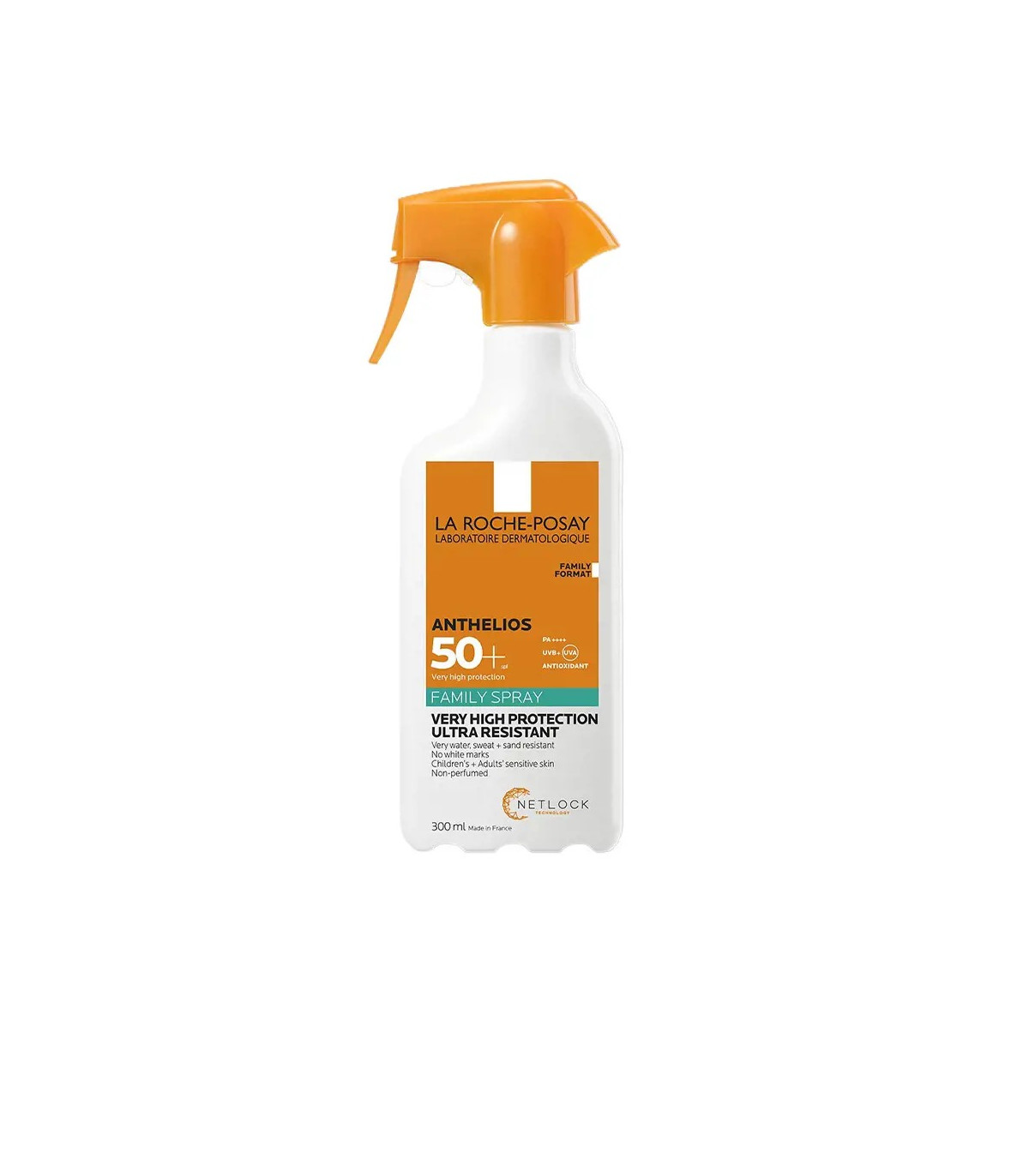 Anthelios Family Spray spf50+ es un protector solar de cuerpo de muy alta protección de amplio espectro UVA/UVB para niños y adultos. Ayuda a prevenir el estrés oxidativo derivado de la exposición a los rayos infrarrojos y a la polución. Contiene una protección óptima y equilibrada reforzada contra los rayos UVA (más estricta que las recomendaciones europeas sobre productos de protección solar) gracias al sistema filtrante patentado con [XL-PROTECT]TM combinado con Agua Termal de La Roche-Posay, calmante y antioxidante. Anthelios Family Spray spf50+ gracias a la tecnología Netlock se absorbe de manera inmediata, no dejando marcas blancas al aplicarlo sobre la piel y es muy resistente al agua, al sudor y a la arena. Tiene una textura con acabado no graso y no pegajoso, en una textura ult