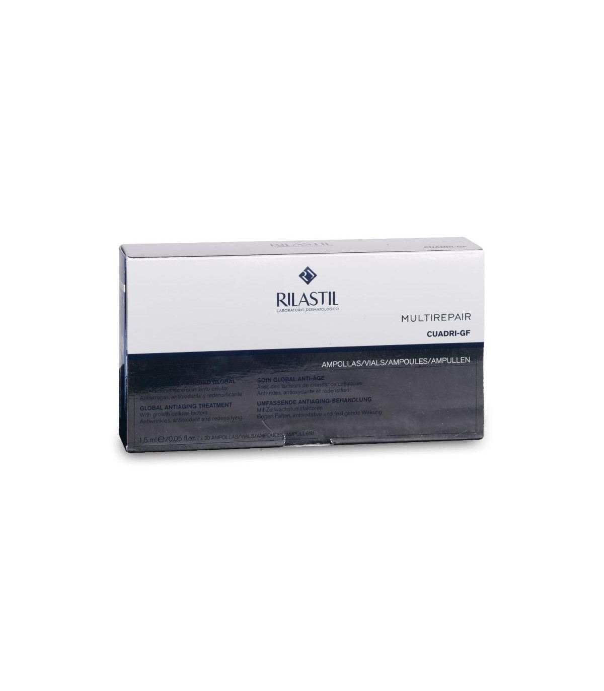 Rilastil Multirepair Cuadri-GF Tratamiento Antiedad 1,5ml x 30ampollas repara tu piel a profundidad Este tratamiento contiene factores de crecimiento celular con propiedades que favorecen la elasticidad y flacidez.Rilastil Cuadri-GF Tratamiento Antiedad 1,5ml x 30ampollasproporciona una reparación profunda en el rostro y mejora los efectos de envejecimiento. Luego de la primera aplicación podrás notar como tu piel se tensa para generar un efecto antiarrugas bastante notorio. Este producto ha sido formulado con factores de crecimiento celular que permiten reducir la flacidez gracias a que interactúa directamente con la síntesis de colágeno y elastina. Su composición con ácido hialurónico reduce las arrugas a mediano plazo. También contiene ácido ferúlico, que funciona como un potente antiox