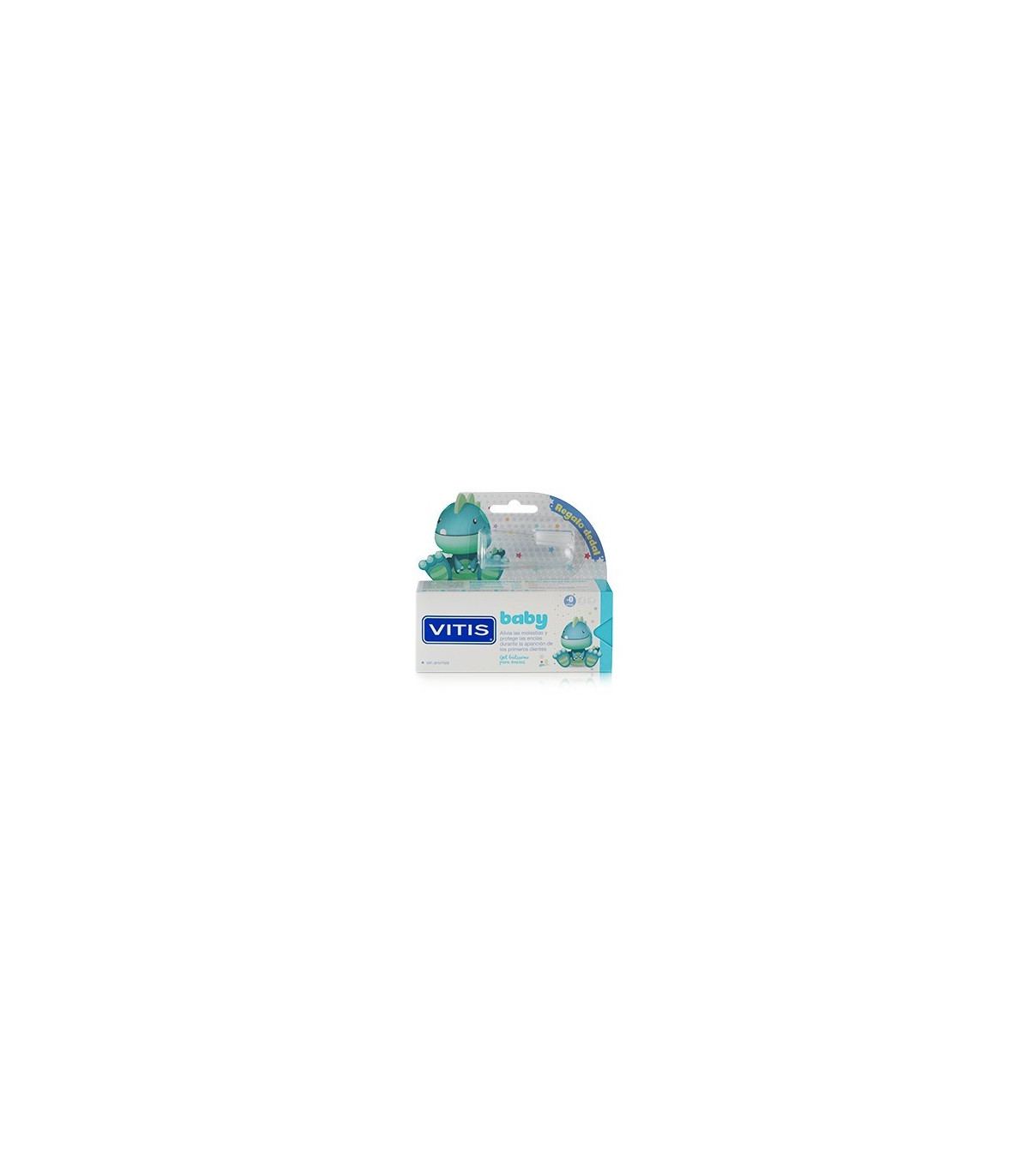 Aplicar una pequeña cantidad de Vitis Baby para las encías sobre un dedal de silicona, sobre la yema del dedo limpio o sobre una gasa.