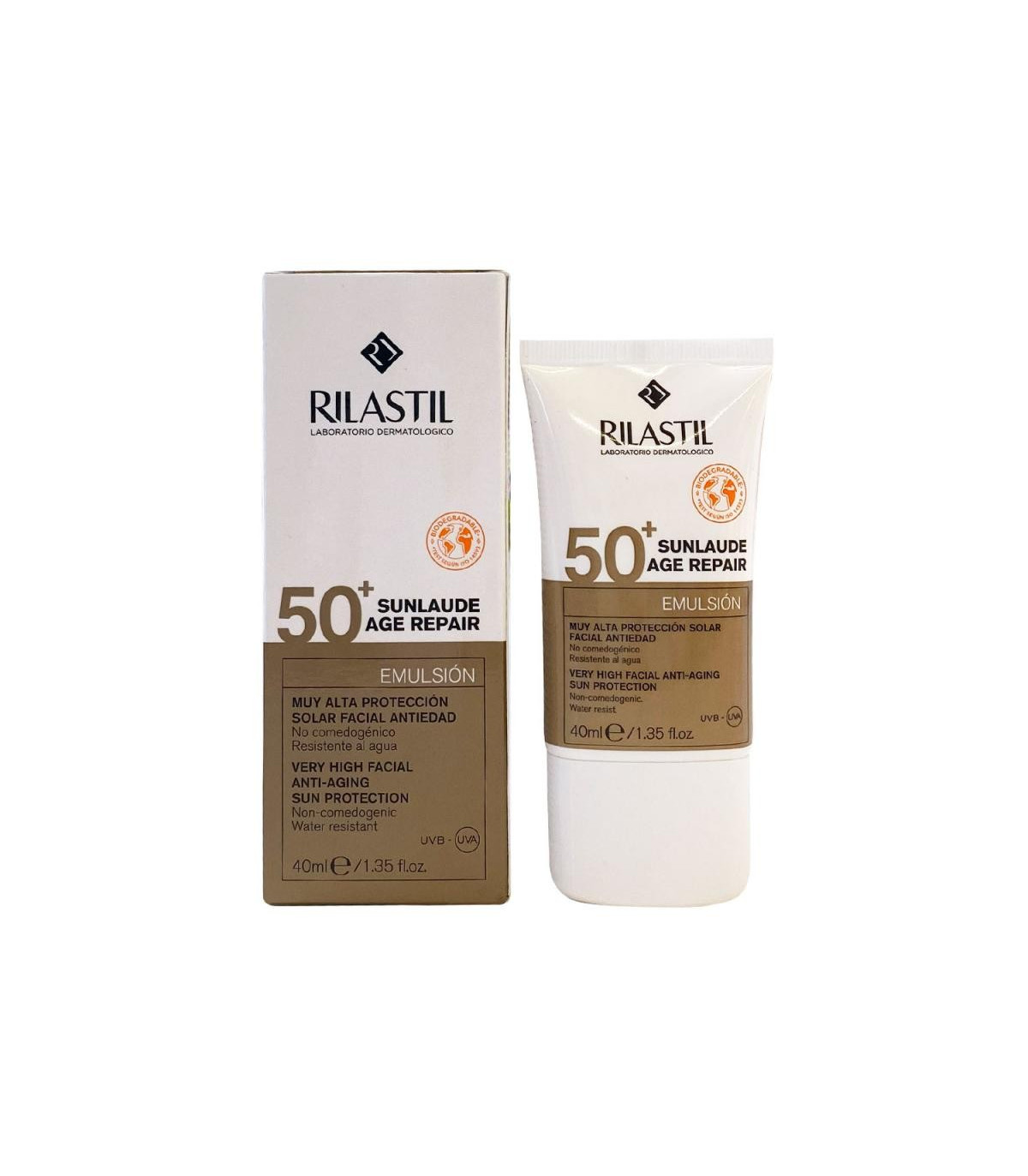 Emulsión ligera y de rápida emulsión de muy alta protección solar facial antiedad de la marca Rilastil Laboratorio Dermatológico con una protección solar Spf50+ y que también cuenta con protección Ultra Violeta UVA y UVB Es resistente al agua y no contiene parabenos.