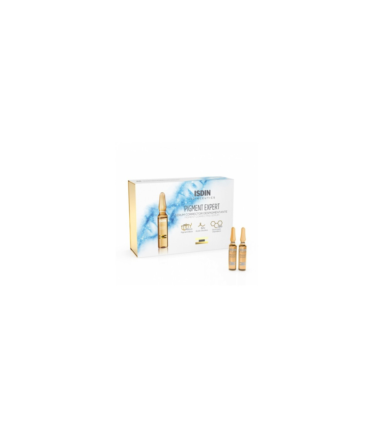 Este sérum corrector está indicado para despigmentar las manchas de la piel y disminuir su tamaño.Isdin Pigment Expert Sérum Corrector 30 Ampollas es un elixir para la piel con propiedades despigmentantes con la fórmula PBLock que contribuye a prevenir la aparición de las manchas y a reducir el tamaño y número de las que ya han aparecido. A este complejo se añade el ácido glicólico para estimular la producción de colágeno y el glicirrizato dipotásico que mantiene los niveles de ácido hialurónico para devolverle flexibilidad a la piel. Deja la misma uniforme y con un aspecto rejuvenecido.