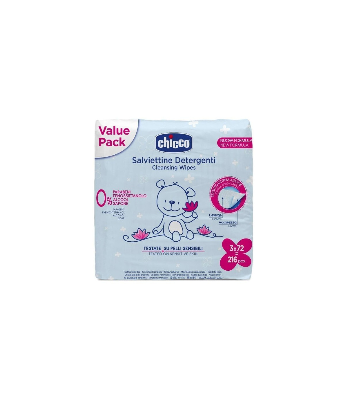 Chicco Trio Toallitas 3 x 72 unidades. Indicado para bebés. Es ideal para usar en cada cambio del pañal o para limpiar la cara o las manos del bebé.Sin SLS y SLES, parabenos, jabón, fenoxietanol. alcohol, ni colorantes. Testado para pieles sensibles.