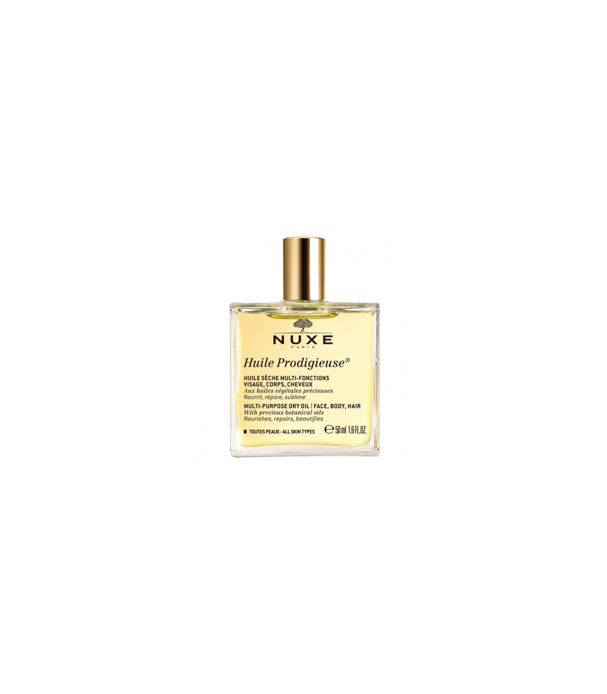 El aceite seco Nuxe Huile Prodigieuse hidrata, nutre y repara la piel, sin engrasar. Su textura no grasa deja una agradable sensación en la piel. Está compuesto por seis aceites vegetales preciosos que lo hacen único. La macadamia, la avellana, la borraja, la almendra dulce, la camelia y el hipérico.