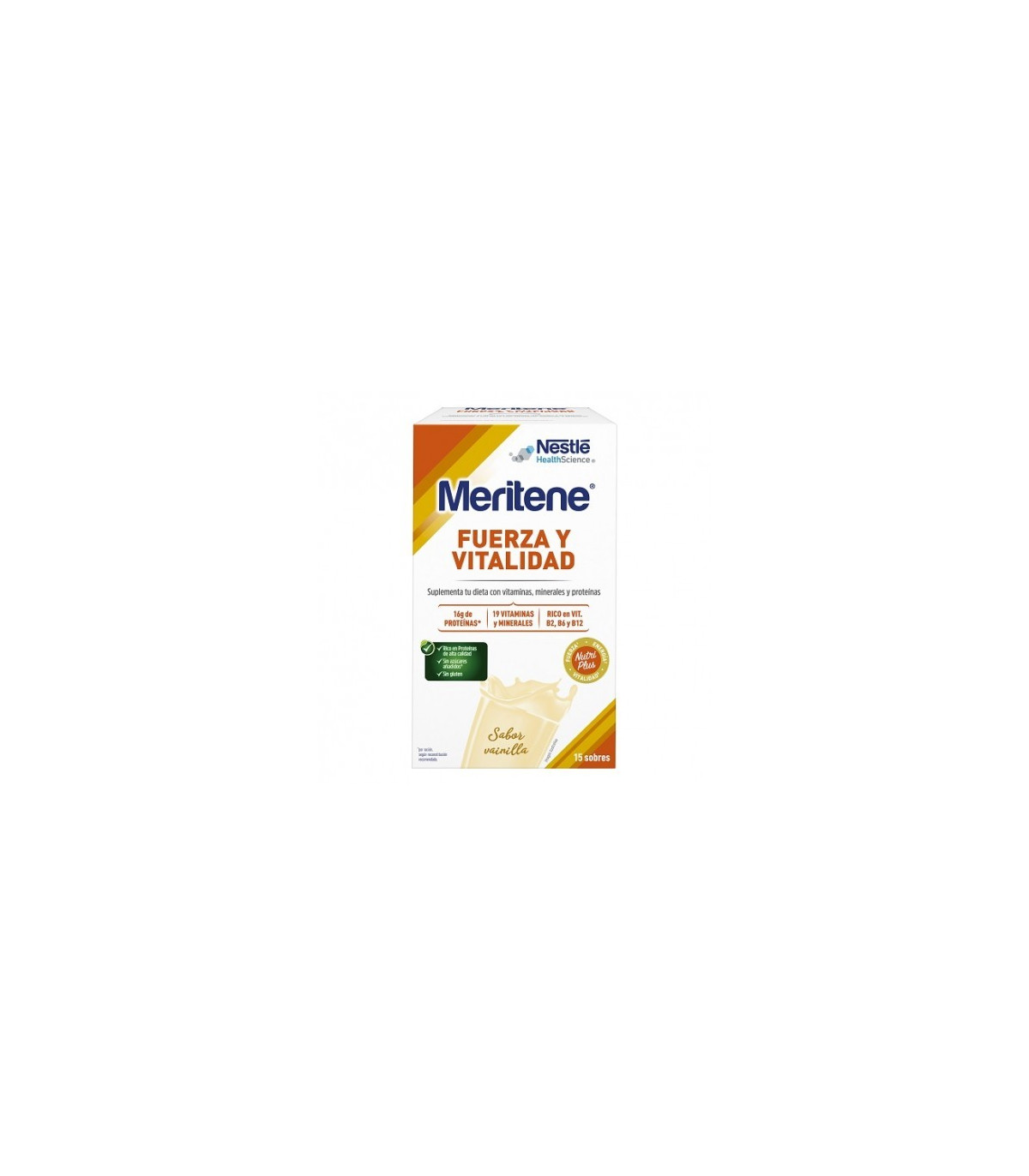 Meritene Vainilla 15 Sobres 30 gr indicado para adultosque necesiten un aporte mayor de proteínas, minerales y vitaminas, y para recuperar el apetito. Sus componentes ayudan a disminuir el cansancio y la fatiga, además contribuyen al desarrollo y mantenimiento de los músculos y loshuesos..